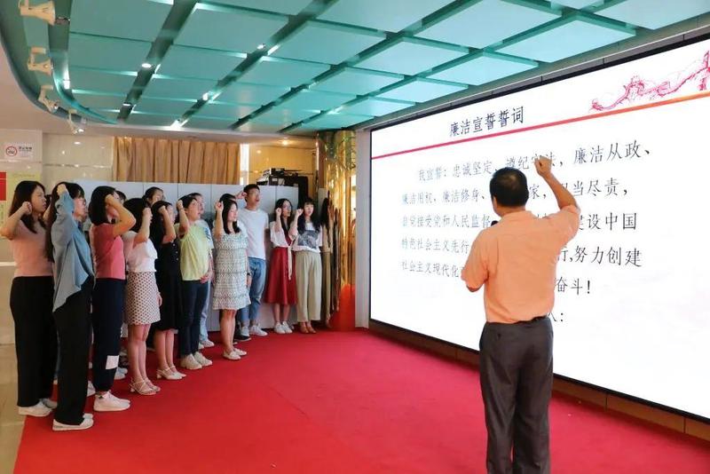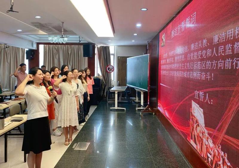 南湖小学组织新入职教师进行宣誓。校长刘建琪为全体教师讲党风廉政主题党课,强调全体教师都要练好思想上的“内功”、守住廉洁自律的“防功”、划清公与私的“硬功”,用党的光荣传统和优良作风坚定信念、凝聚力量,做新时代“四有”好教师。