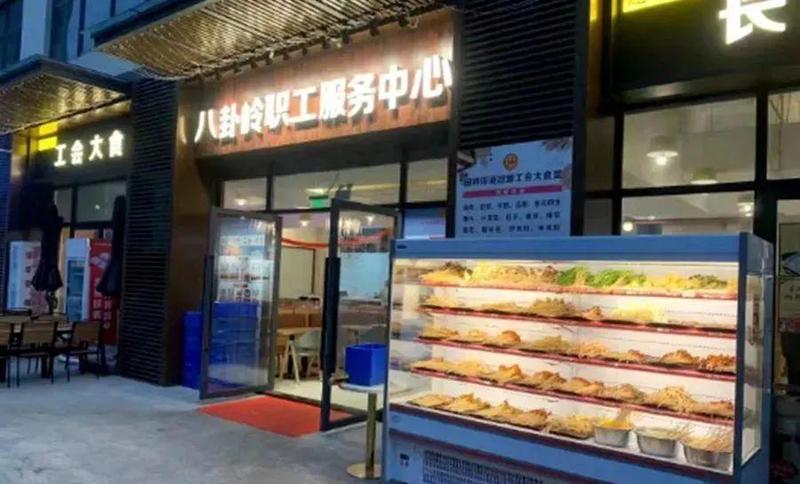 食堂建筑面积1100平米,具备中央厨房+定向配送功能,以现场供餐和专业的冷链配送等方式,覆盖服务八卦岭工业区近3万名职工,切实服务于广大职工的实际需要,解决园区、楼宇职工就餐难问题,为广大职工提供安全可靠、快捷便利、多样化等的餐饮服务和综合性一体化服务。园岭街道总工会将依托工会大食堂建设职工服务中心,为园区企业和职工提供职工入职、法律咨询、困难救助、深圳工会会员卡办理等便捷、一站式服务,将工会大食堂打造成具备工会大食堂、教职工服务中心、教职工培训基地三个功能,服务要素集约、社会资源整合的职工综合服务基地,努力打造工会大食堂2.0版本。