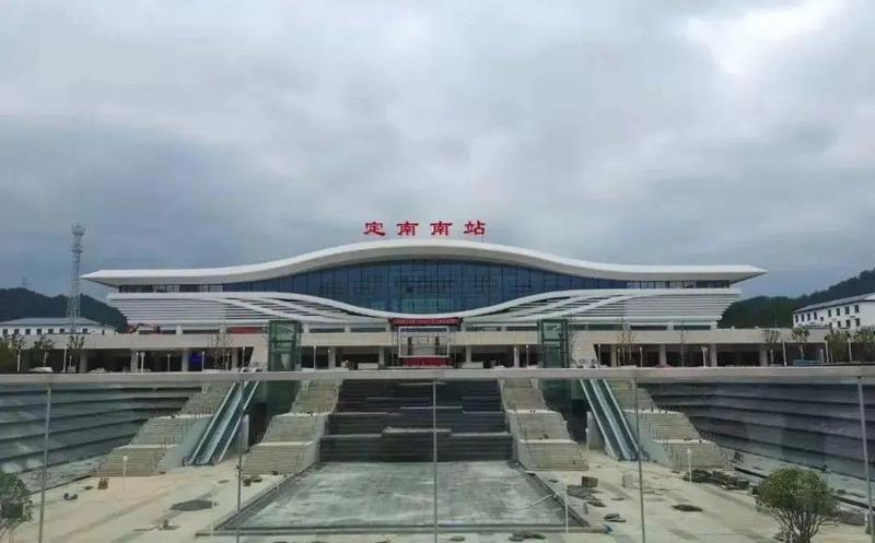 定南南站位于赣州市定南县清华大道西侧,站房建筑面积为9997.6平米,车站站场设2台6线,其中2条正线,4条到发线。定南南站采用“九曲东江源,云台赣南门”的整体构思,站房的外观形似一颗水珠,来呈现“滴水成珠”的意境。