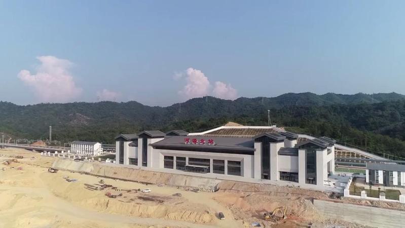 河源北站位于河源市东源县黄田镇东北处的山区腹地,是广东境内海拔最高的一个站点。建筑面积9997平方米,站台规模为2台4线,结构为地下一层,地上两层,以“客家名郡,东源门户”为设计理念。