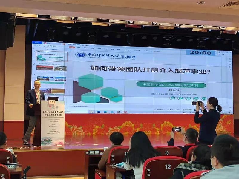 5年来,何光智主任坚守初心,谨记教诲,勤于思考,勇于创新,建设并带领介入团队开展了穿刺活检、置管引流、囊肿硬化和肿瘤消融四大版块业务,并在2017年3月开放了深圳首家介入超声病房,为深圳地区及周边地区广大患者带来福音,促进深圳地区介入超声蓬勃发展,获得了同行的好评与赞誉,同时也多次获得中华医学会超声分会梁萍主委的称赞!超声科连续两届被评为光明区医学重点学科。岁月悠悠,深情依旧。2021年10月20日,在第22届全国介入超声新技术新进展学习班筹备期间,何光智主任受到梁萍教授的邀请,希望作为优秀学员回到中国人民解放军总医院,在这届学习班上为众多新学员分享开展介入超声业务及成功的经验。