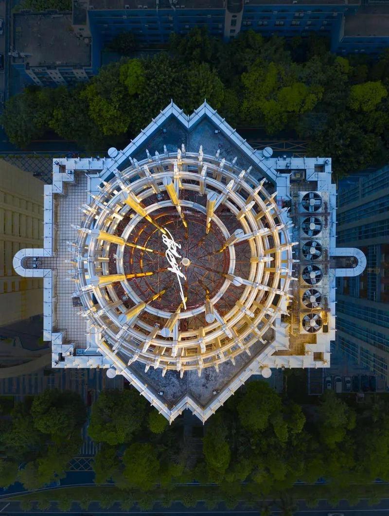 万基商务大厦,垂直视角向下俯拍,很像一只金色镂空手表盘,一圈向云端挺立的擎天柱像金箍棒一般直插当中,它的立体让高楼显得格外高耸,仿佛要穿透图片直戳人心。