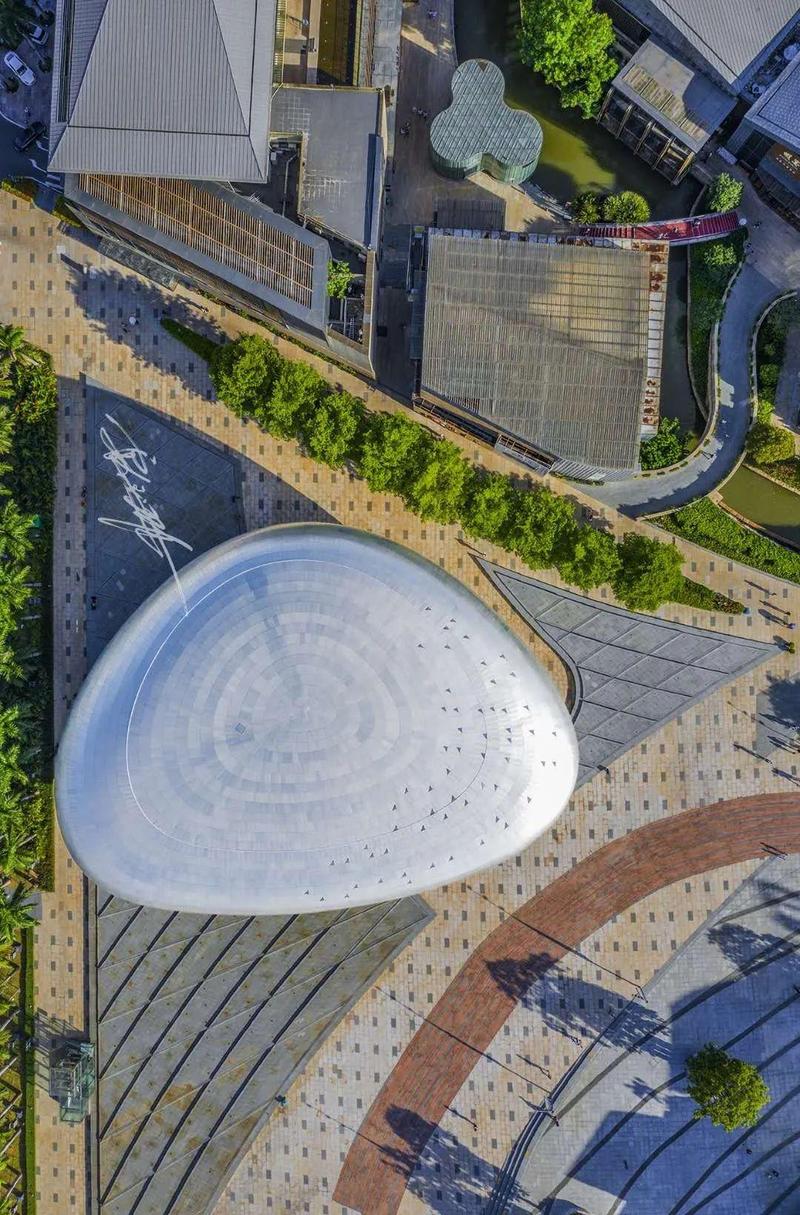 这两个巨大贝壳都是水乐园的巨大空间场,下面的为露天设施,上面的海蓝色盖子则为7000平米的室内戏水乐园。从空中向下望去,它就像是一个被人扭开了壳的蛤蜊,散落在了草地上。