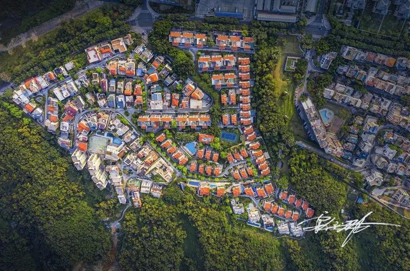 在银湖有一块世外清净之地,无人机捕捉到了这样的一条鱼,它是两个别墅群的组合体。鱼头部位是金湖山庄,鱼尾部分是颐园别墅。有趣的是,两个别墅区刚好锯齿合缝,形成了一个栩栩如生的鱼形。