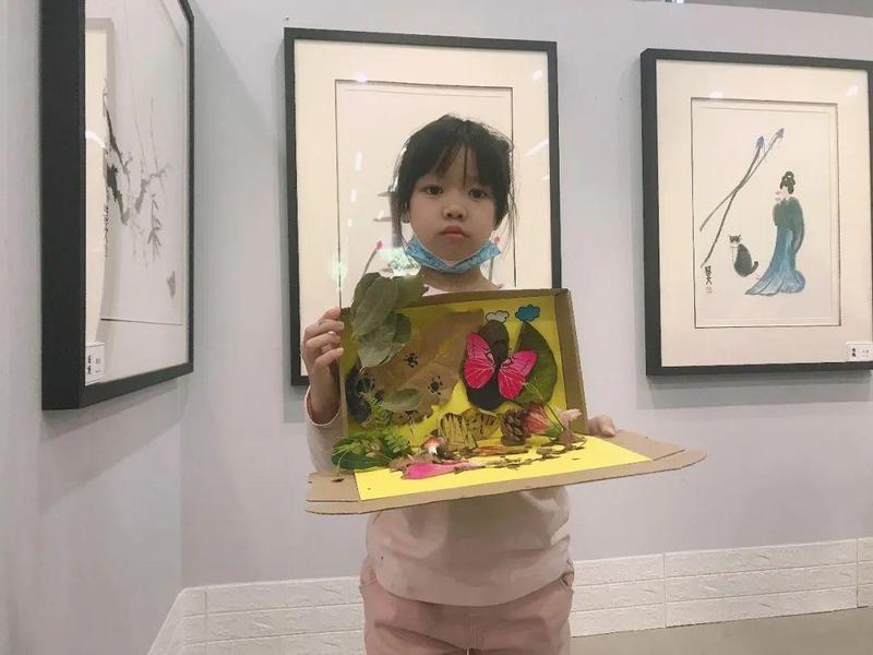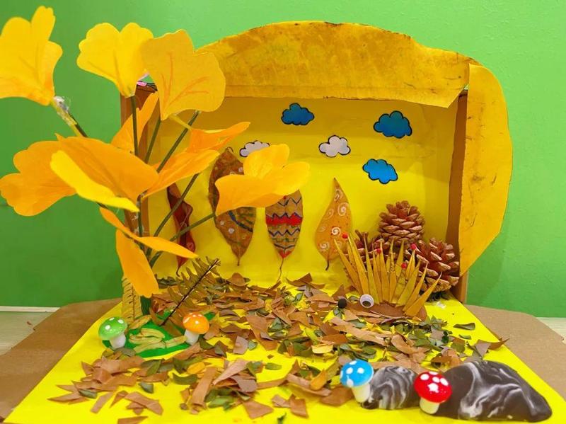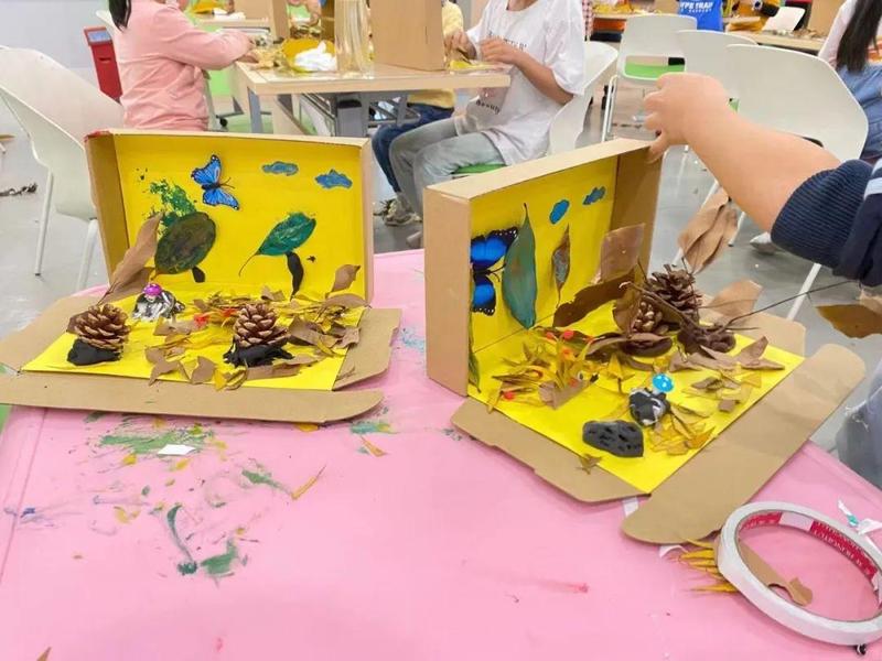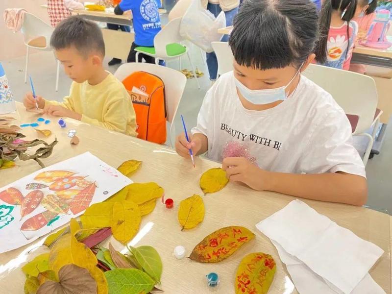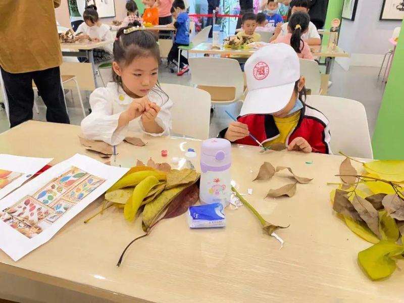 这次的手工课堂主题是“落叶故事盒子”,活动开始前,先由家长和小朋友一起到公园体验秋天的氛围,捡拾落叶,然后再回到馆内,将落叶交给小朋友,让他们发挥独特的想像力,在落叶上作画,将黏土变身成动物,最后形成一幅幅“秋天来了”。