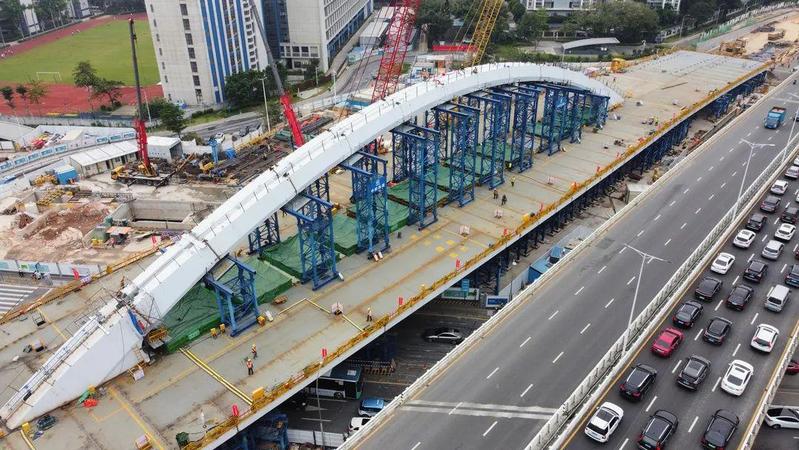 10月28日,随着最后一段拱肋缓缓吊装至合龙位置,国内首座站桥合一大跨度钢箱拱桥——深圳市黄木岗交通枢纽工程永久桥主拱顺利合龙。