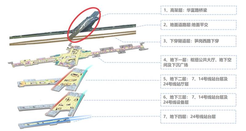 永久桥(上图红圈所示)位于枢纽上下7层的最上方,上跨华富路和泥岗西路,是国内首座站桥合一大跨度钢箱拱桥。