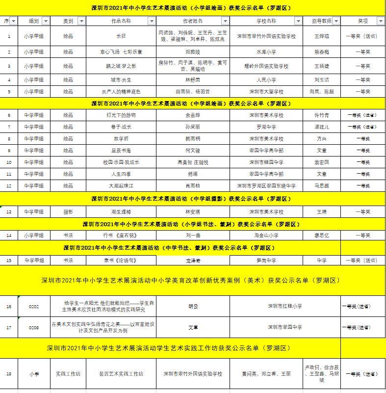 罗湖美术教师在今年各项比赛中屡获佳绩:2021年深圳市首届美育教师基本功大赛中,罗湖参赛的13名老师,共有6人获市级一等奖,5人入选省级美育基本功比赛,4人进入广东省的总决赛。这个成绩在全市各区参赛队伍中名列前茅;在刚刚结束的深圳市青年美术教师教学技能大赛中,罗湖区中小学四位教师名列前茅,其中,小学组仙桐实验学小学陆心怡荣获全市第2名、淘金山小学邹美琪老师荣获全市第3名,均为一等奖获得者。中学组和高中组也分别获得全市第4名的优异成绩。