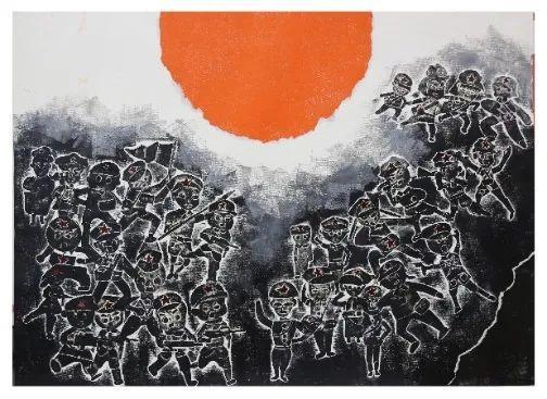 作品说明:孩子们用裁纸剪贴的方式复原了革命时期红军长征的画面,展现了小红军们变化丰富的姿态、势如破竹的气势。画面下半部分的黑色暗示这段时期的艰辛,画面上半部分的红日代表党的光辉最终会突破黑暗,带领中国走向新生。