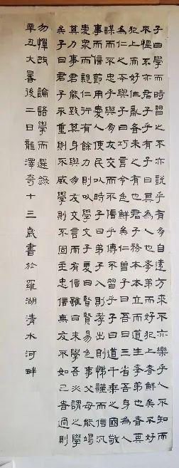这幅作品是我在2021年暑假期间在朱良齐老师的指导下完成的。一放假,朱老师就要求我和其他同学一起回到学校,认真准备备战这次的深圳市中小学生艺术展演。经过认真选题,我选择了中国古代的经典《论语》。在老师的帮助下,这幅作品我反复书写了3遍,笔下的每一点、每一横都蕴藏着我对中国书法的热爱和对中国书法的膜拜之情。这幅作品的完成,让我感悟到完成任何事情都是必须要坚持不懈的,而且还要专心致志。