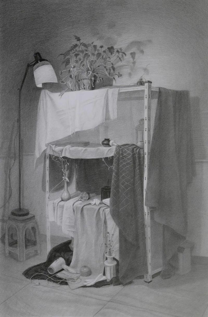 作品说明:本作品为素描静物,各种静物错落有致的摆放出设计感,在聚光灯下四周昏暗,营造出一种静谧安详的氛围感。我比较满意那棵绿植,灯光照射出绿植的生动,投射在墙面的光影散乱而有条理,十分散逸。
