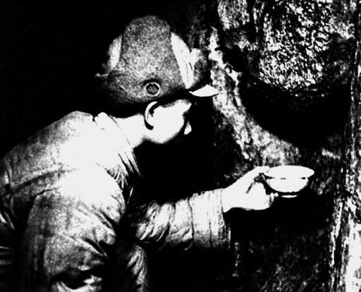 志愿军战士在坑道中接岩石上滴下的水,来源:中华人民共和国国防部网站