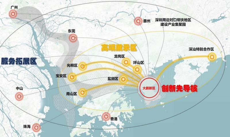 以大鹏新区为创新先导核,以深圳其他各区为服务拓展区、以大湾区城市群为外延辐射区,在深圳周边对口帮扶地区建设多个产业集聚园。