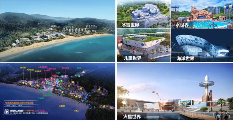 片区占地面积约150万m²,总投资约262亿元,目前已完成投资199亿元。集合主题乐园、豪华度假酒店、休闲公园、时尚主题商业街、文化演艺演出、特色国际餐饮、康养健身、海上运动、滨海公寓等9大业态近20个度假项目,目前,万豪酒店、水世界、儿童世界已开放营业。