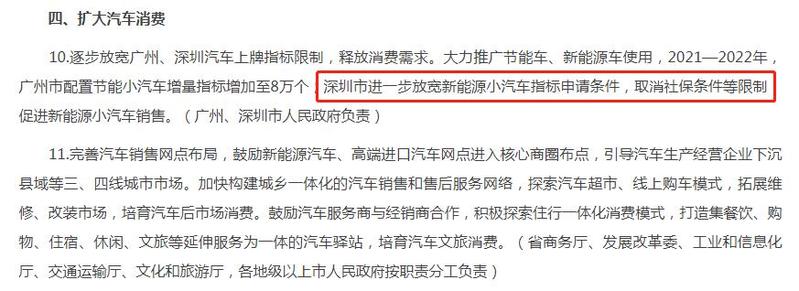10.逐步放宽广州、深圳汽车上牌指标限制,释放消费需求。大力推广节能车、新能源车使用,2021—2022年,广州市配置节能小汽车增量指标增加至8万个;深圳市进一步放宽新能源小汽车指标申请条件,取消社保条件等限制,促进新能源小汽车销售。(广州、深圳市人民政府负责)