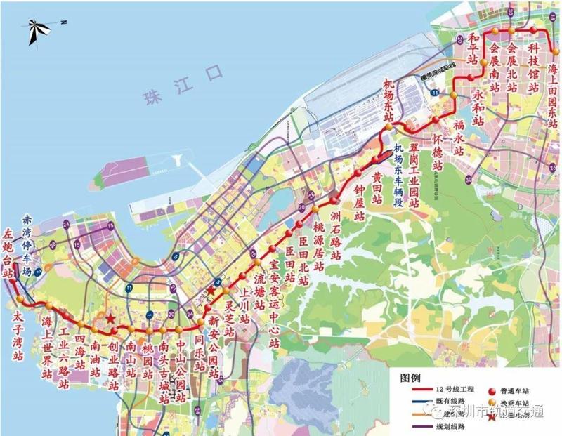 地铁12号线起自南山区左炮台站,自南向北穿越南山中心区、宝安中心区、福永片区、大空港及会展片区后,终至宝安区海上田园东站。线路全长约40.6km,全线采用地下敷设方式;共设站33座,其中换乘站18座。