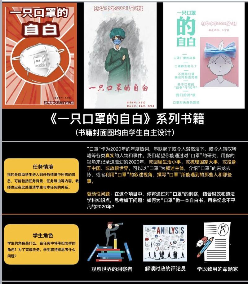 (1)多维度的项目式作业提升核心素养:学子说法栏目、2025年全运会策划案、一只口罩的自白、中国梦之2021年大事件评选......利用真实而有意义的项目,关注项目与核心的学科知识及实践深度融合,提倡同伴之间、师生之间有意义的且富于支持性的互动,运用过程性评估改进教学,迸发创意,滋养品格。