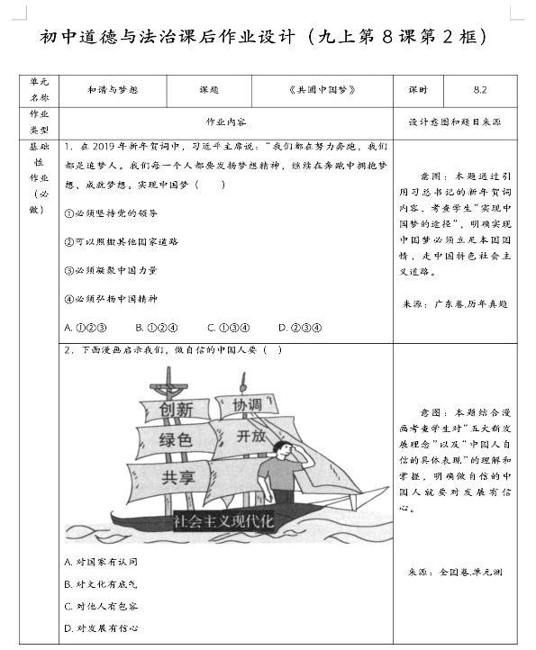 通过这项目式作业,让学生能够做到运用所学知识,同时培养学生的合作能力,表达能力和创新能力。培养学生的政治认同、科学精神、公共参与的素养,体会知识要放在具体情境当中,知识之间具有系统间的系统性和关联性。