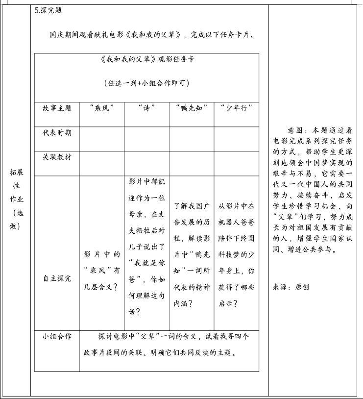 (3)宽领域的融合型作业激活感知力:时政播报、课堂情景剧、观影任务卡、英文手抄报......整合知识,提升能力。