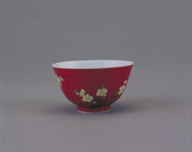 故宫藏《乾清宫珐琅、玻璃、宜兴胎陈设档》中罗列了从康熙至乾隆朝宫廷收藏的珐琅器共408件,其中雍正朝珐琅彩器有201件,档案记载珐琅彩器中绘有红地白梅花图案的器物有宫碗、四寸碟、三寸碟、盅4个品种,共14件,由此可见,雍正帝喜爱此图案。珐琅彩器绝大部分收藏于台北故宫,北京故宫只有一小部分收藏。现台北故宫中可见到档案中记载的红地白梅花图案的碗、碟,未曾见小盅。故宫资料中发现的这对小盅,与档案第67条记载的“瓷胎画珐琅白梅花红地盅”品名、款识完全一致,小盅虽有残破,但却解决了二百多年来悬而未决的问题,意义重大。