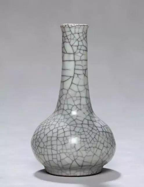 该哥窑小瓶,器型小巧雅致,釉汁通体肥润,釉色沉厚细腻,光泽莹润,如同凝脂;开片细密,线条极具美感,又富于变化,犹如冰裂般变化万千于那隆冬江河之中,别具一种古朴、自然的天趣。釉内含有气泡,如珠隐现,犹如“聚沫攒珠”般的美韵。