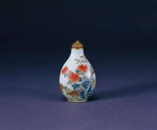 烟壶小口,口沿施金釉,配铜镀金錾花圆盖。短颈,鼓腹,圈足。通体施白釉,腹部绘菊花鹌鹑图,生动自然。足底有红色篆书“乾隆年制”四字款。