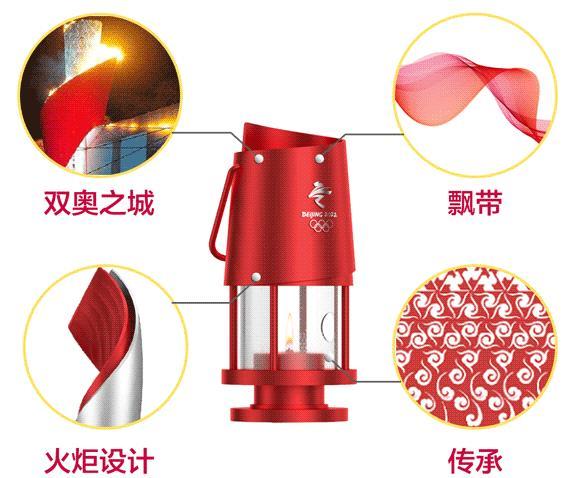 环绕在顶部飞舞的红色丝带,与火炬“飞扬”视觉形象统一,象征着拼搏的奥运激情。