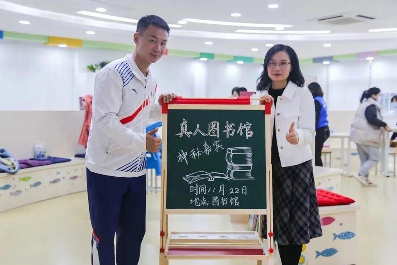 全运会冠军化身“真人图书馆”,分享成长点点滴滴。荣获2021年第14届全运会毽球双人赛男子双人组冠军的莲南小学体育老师罗攀向四到六年级的学生代表分享了自己冠军之路上的感人小故事。