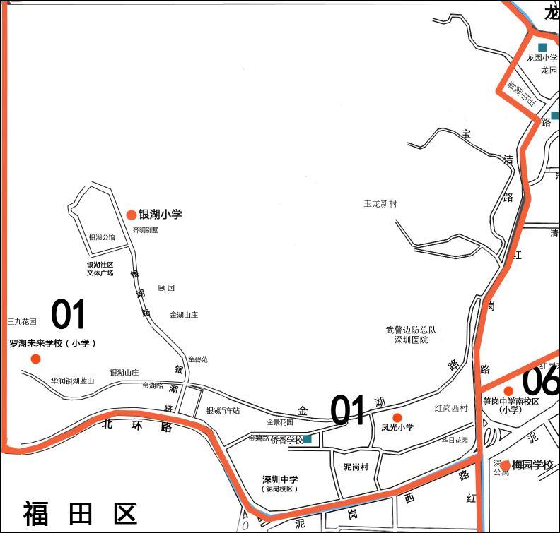 ◆01大学区由罗湖未来学校小学部、凤光小学、银湖小学等3所学校组成,保留现01大学区范围不变。