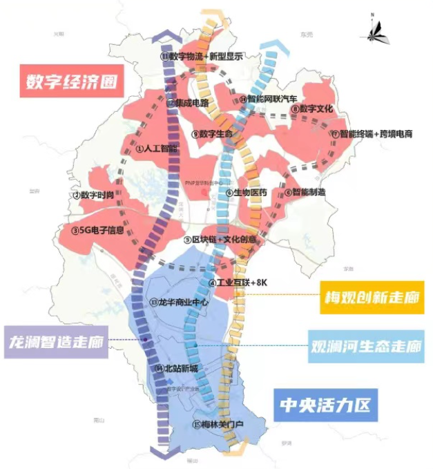 按照“增心提级、廊带支撑、片区引领”原则,龙华区将构建“一圈一区三廊”空间格局,北部打造全球万亿级数字经济圈,南部打造深圳中央活力区,打造纵贯南北的三大都市走廊(梅观创新走廊、观澜河生态走廊、龙澜智造走廊);提升北站国际商务区、九龙山数字城、鹭湖中心城、龙华国际商圈、梅林关片区、大浪时尚小镇、观澜文化小镇等重点片区发展能级。