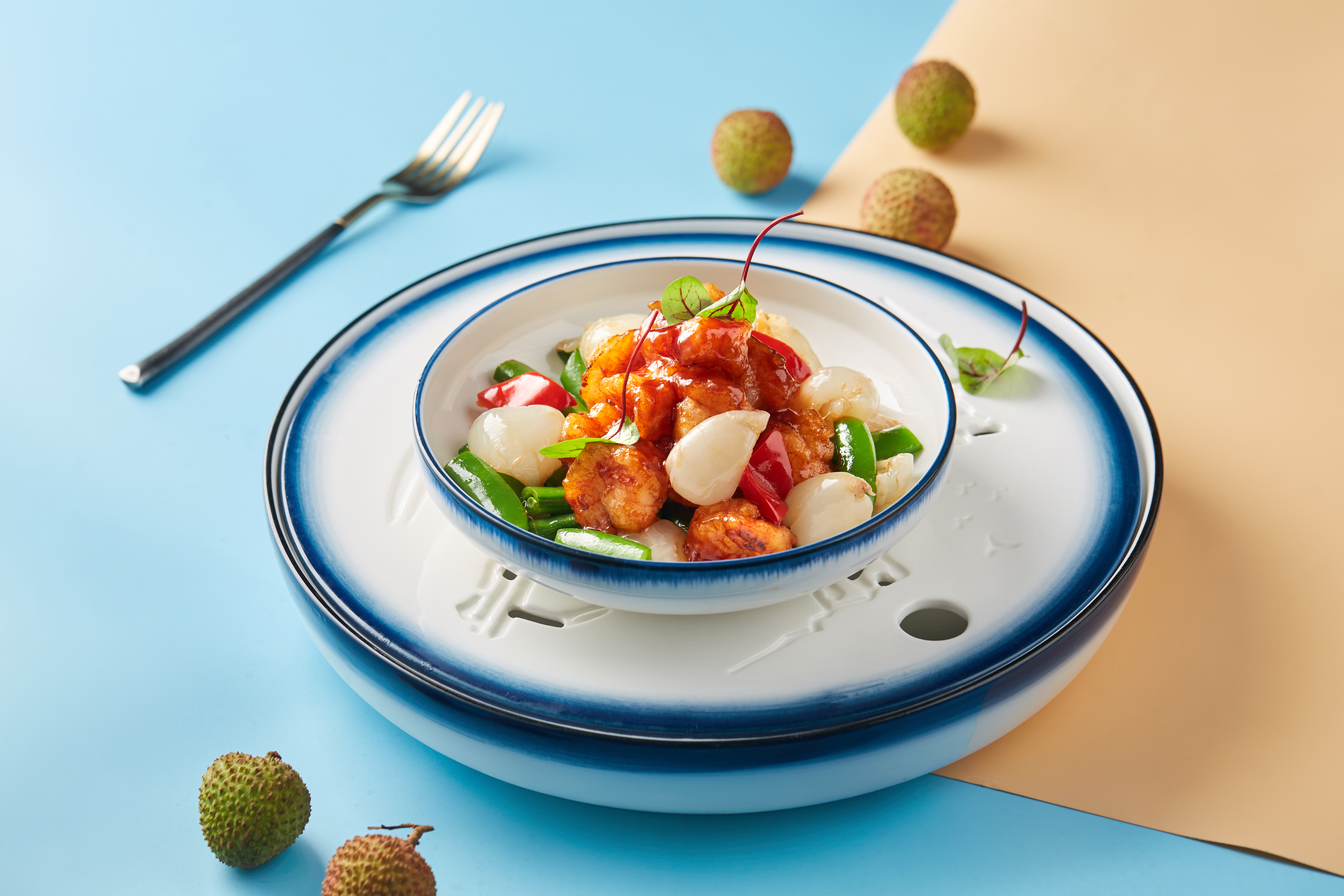 粤菜师傅延续旧日食风,巧妙设计,将荔枝肉与虾仁共烩-碧绿虾仁炒荔枝肉.
