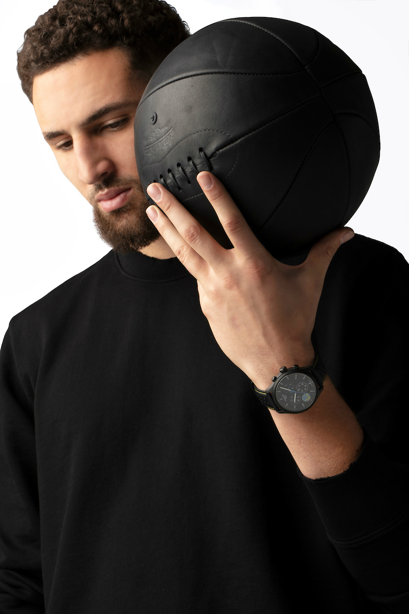 图3-4:天梭表全球形象代言人克莱•汤普森佩戴天梭速驰系列勇士队特别款腕表
