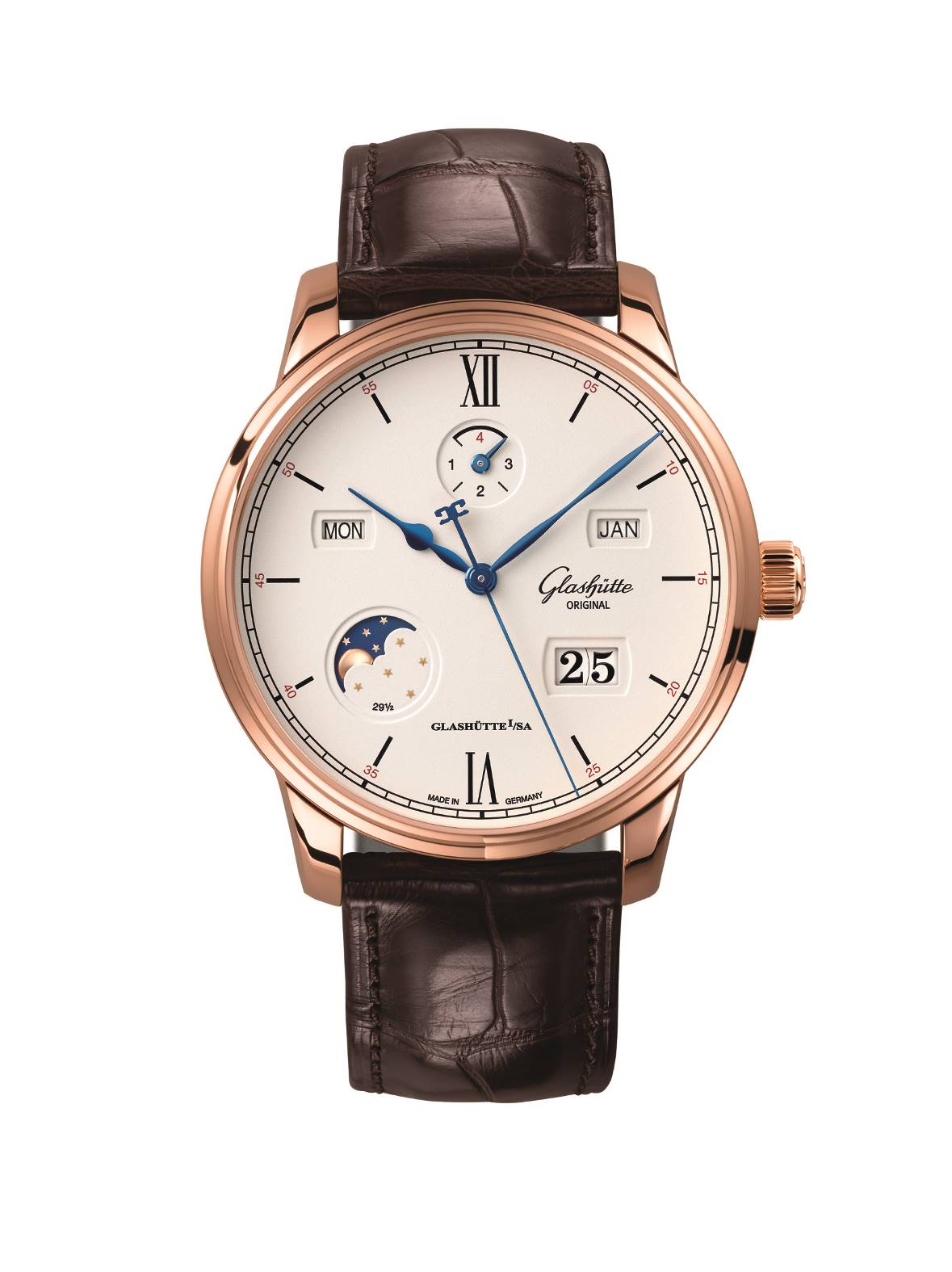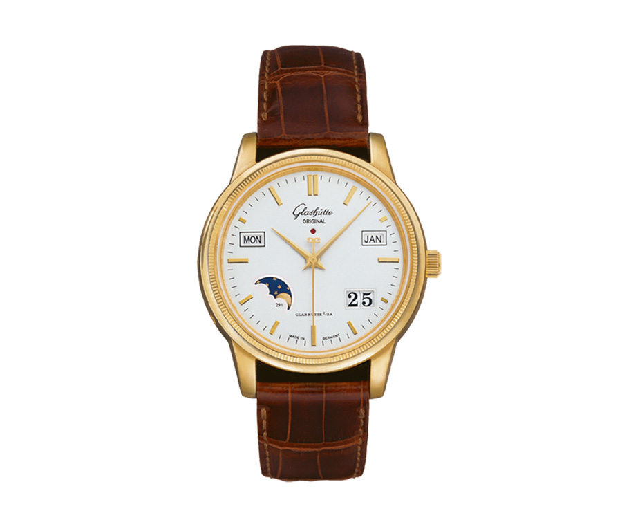 而格拉苏蒂原创Senator Perpetual Calendar议员卓越万年历腕表的设置和调节,堪称简便:日期设置可直接通过显示窗口查看;通过表壳两侧隐藏式调校按钮,可分别调节星期、月份和月相显示。100小时动力储存功能非凡,即使表主不佩戴腕表,也能确保各项显示的在数小时内准确无误,尤其是调校按钮非常实用,在必要情况下只要操作几下,即可更改星期、日期和月份。