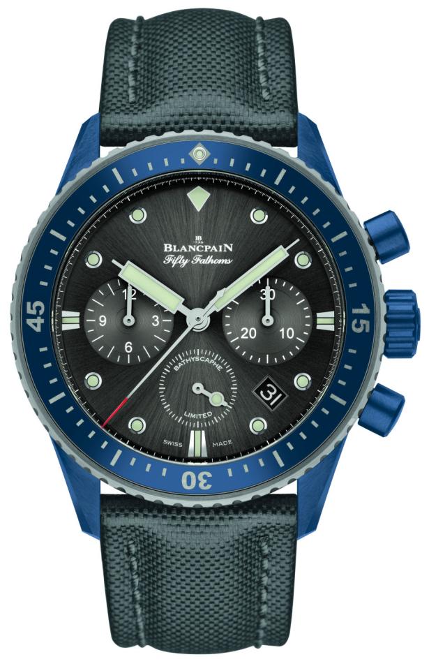 左:宝珀五十噚系列钛合金瞬跳大日期腕表,6点位大日期双窗显示功能首次运用于这一系列