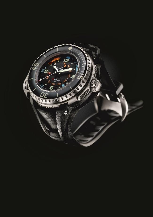 作为五十噚系列的巅峰之作,宝珀 X噚复杂机械潜水表,强势演绎了品牌的创作激情和非凡能力。 X噚到底为何物?如果字母“X”代表一种变量,那么 X噚腕表则完美综合了三层内涵——既能测量不断变化的深度,又可以彰显极限运动的理念,更拓展了有史以来各种机械潜水腕表的概念范畴。作为专业机械潜水腕表, X噚不仅具备界定潜水腕表的所有特性——防水、稳健、抗磁性、水下易读性、单向旋转表圈、荧光显示、旋入式表冠,还加载有两个深度指示器 (测量深度可达90米,同时又能突出显示至关重要的0-15米刻度段,并确保系统的精确性)、一个极限深度指针 (专门用于显示潜水的最大深度 )以及一个5分钟倒计时器 (精准计算上浮过程中做减压停留的时长 )。仅凭借这些“王牌”特性, X噚就足以在机械潜水表的世界里堪称“第一”。