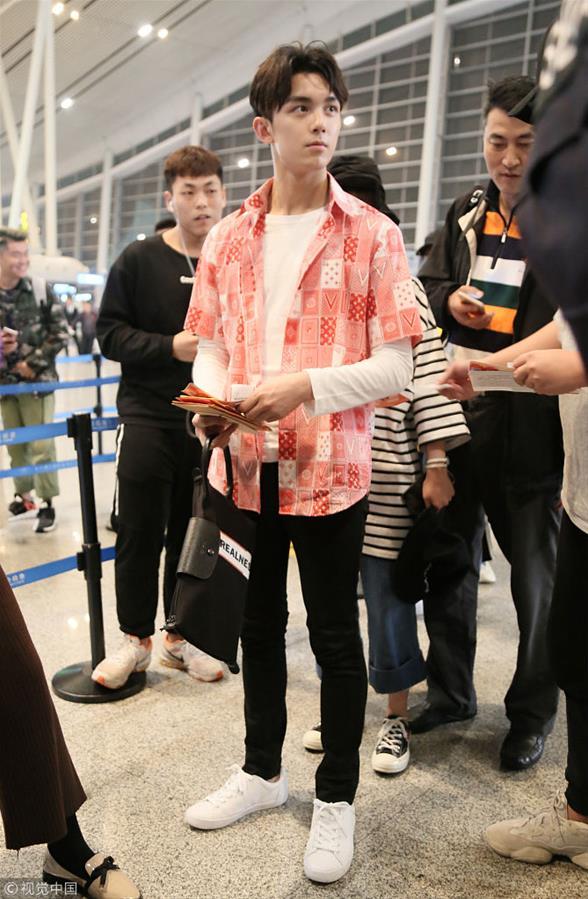 湖南长沙,吴磊现身长沙黄花机场。吴磊机场街拍。身穿红色LV扑克牌印花短袖格子衬衫,内搭白色长袖T恤,下穿黑恶休闲裤,脚穿白色系带休闲鞋。