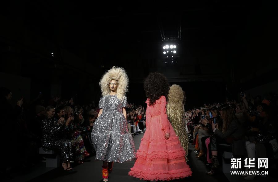 2月17日,在英国伦敦,模特在2019伦敦秋冬时装周上展示Ashish品牌服饰。