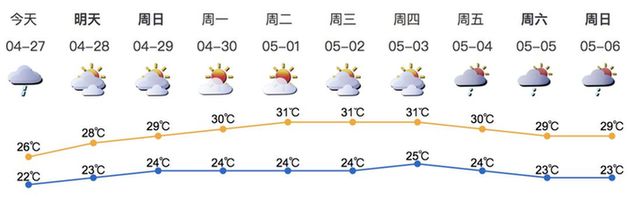 ②市气象台预计,假期前(4月27-28日)我市有阵雨,以阴天到多云天气为主。五一假期天气总体平稳,多云可见阳光,早晚有轻雾,天气渐趋炎热,最高气温可达30℃以上。市气象台提醒,五一假期前期广东省西部以及周边省份有明显降雨过程,有大雨局部暴雨到大暴雨,有出行打算的市民应关注出行目的地的具体天气预报。