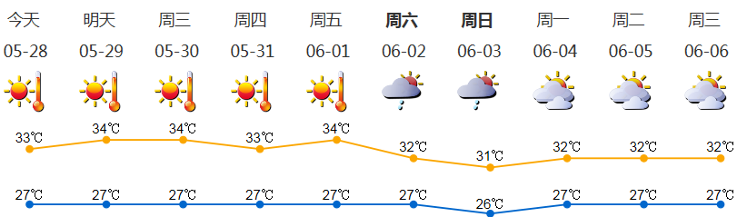 我市多云间晴天,天气炎热到酷热,局地有短时阵雨或雷阵雨;气温27-33℃;西南风2-3级;相对湿度55%-90%。