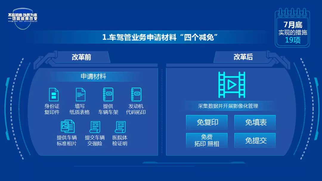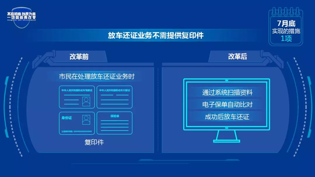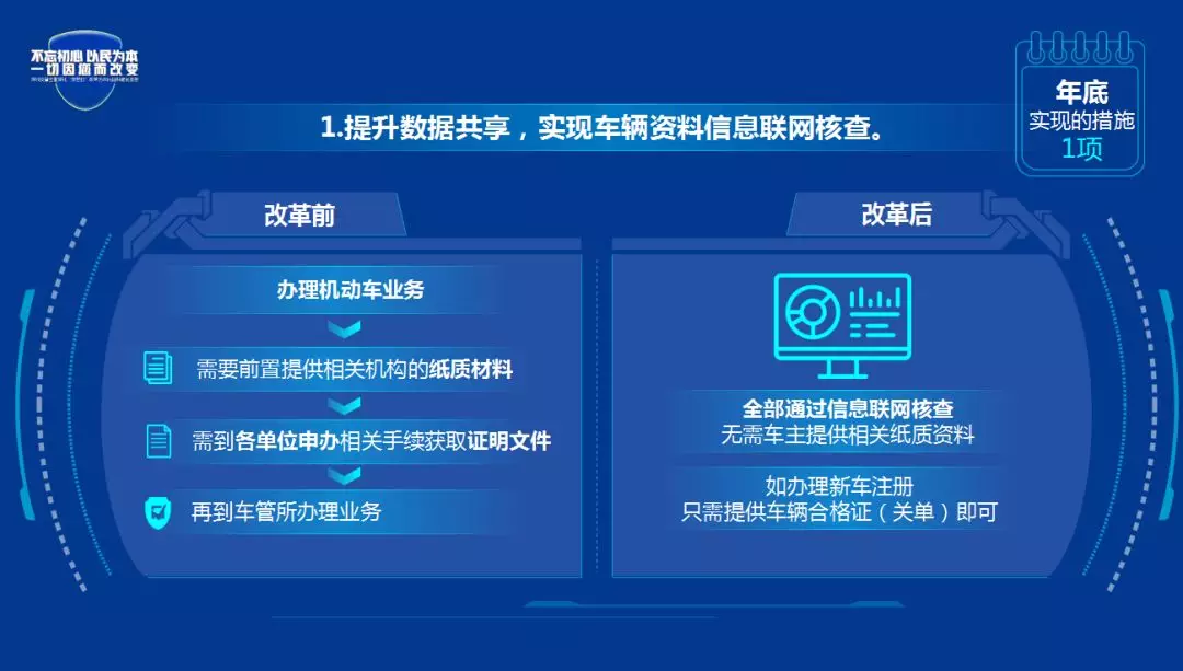 改革后:采集身份证明、人像等数据并开展影像化管理,实现身份证明文件免复印、业务办理免填表。办理机动车业务实现免费拓印、照相。保险、体检、报废车回收等数据已经实现联网数据核查,实现群众免提交。