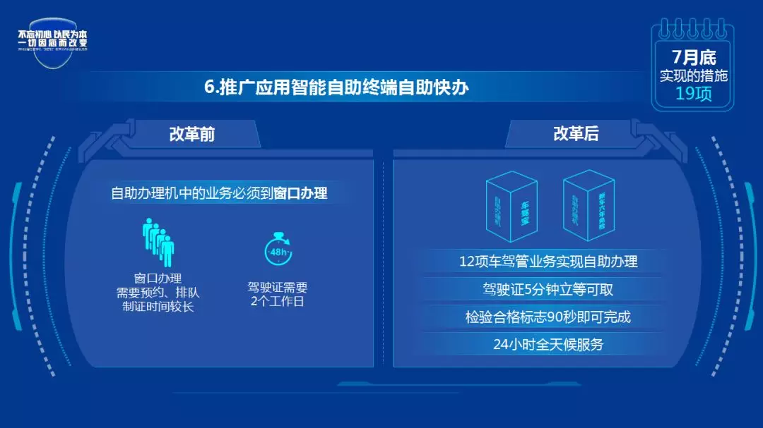 改革前:自助办理机中的业务必须到窗口办理,除了需要预约、排队,制证时间较长。驾驶证需要2个工作日。