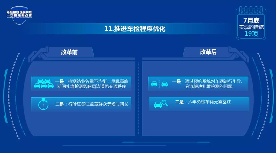 改革后:一是通过预约系统对车辆进行引导、分流解决扎堆检测的问题;二是六年免检车辆无需签注。