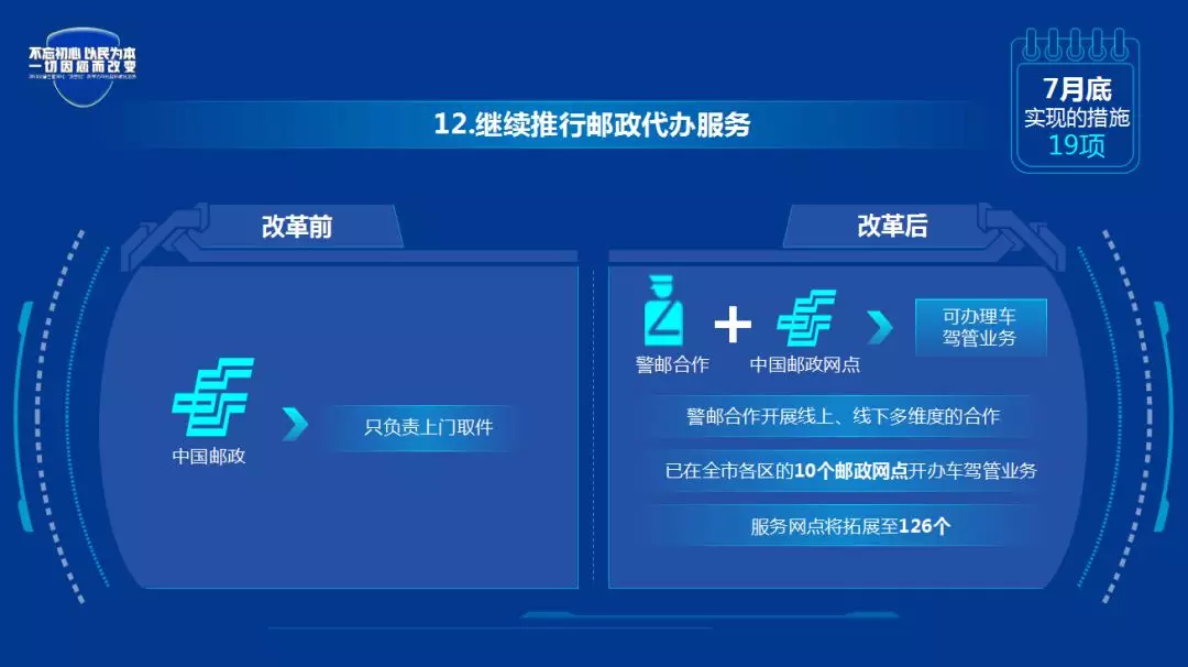 改革后:将窗口、身份证认证、服务前置,与邮政部门合作,服务上门、业务范围拓宽至34项。快递员上门收件时用PDA完成刷脸动态身份认证、身份信息读取以及获取电子签名等步骤确认办事人身份后现场办理车驾管业务。群众网上下单后即可在家门口办理除考试、验车业务外的车驾管业务。