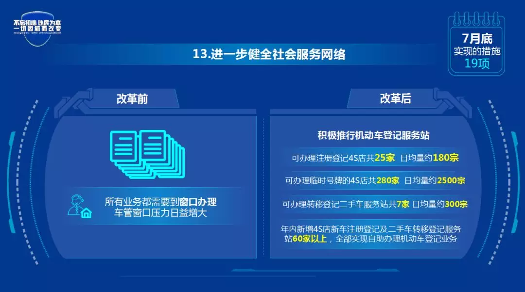 改革后:7月底实现群众在互联网自助查询注销流水在线便民服务。群众办理机动车注销手续后,登录互联网即可查询注销流水,无需再到车管所窗口查询。