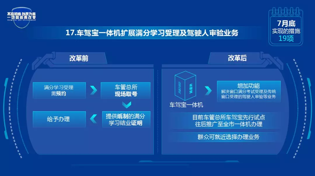改革后:在车驾宝一体机增加功能,解决窗口满分考试受理及传统窗口受理的驾驶人审验等业务。目前车管总所车驾宝先行试点,往后推广至全市一体机办理,群众可就近选择办理业务。