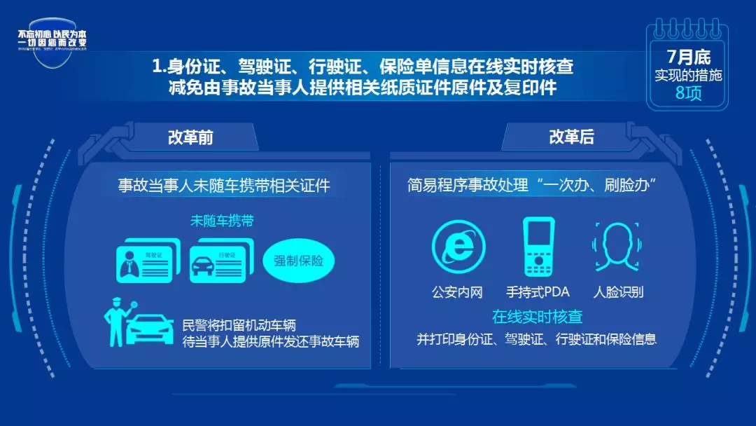改革后:民警通过公安内网、手持式PDA等、通过人脸识别等技术在线实时核查、并打印身份证、驾驶证、行驶证和保险信息。减免当事人因未随车携带上述相关证件被交警部门扣留机动车,避免事故当事人为提供相关证件而来回奔波,缩短事故处理时间,实现简易程序事故处理“一次办、刷脸办”。
