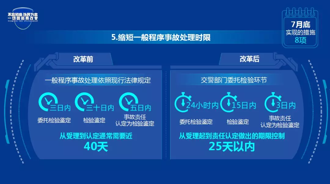 改革后:在交警部门委托检验环节由三日内缩短为24小时内,在检验鉴定环节非重大疑难事故的期限由30日内缩短为15日内,检验鉴定结束后作出事故认定由5日内缩短为3日内,将非重大疑难事故处理从受理起到责任认定做出的期限控制25天以内。