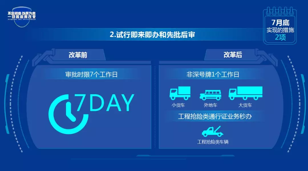 改革后:一是非深号牌(全市区域)、大货车、小货车、会展车等车辆类型的通行证业务即来即批,材料齐全在受理后1个工作日审批完成;二是对于工程抢险类的车辆类型通行证业务秒办,实行先批后审。