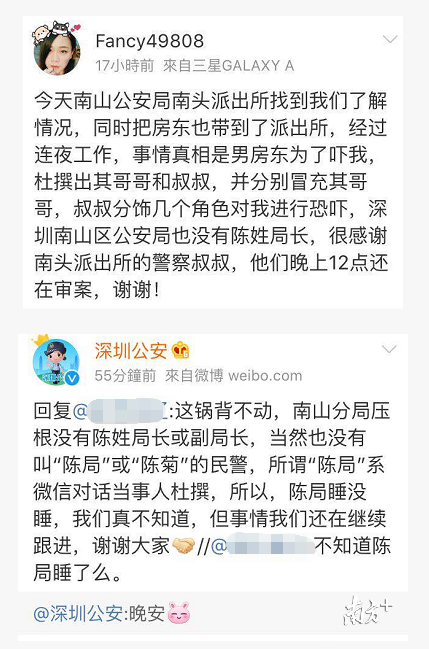 23日凌晨,网友Cherry发布微博称,南山警方已对房东开展调查,查明房东是为了威胁租客,杜撰出其哥哥和叔叔,并冒充哥哥、叔叔等人对其进行恐吓。