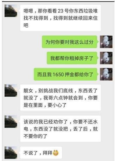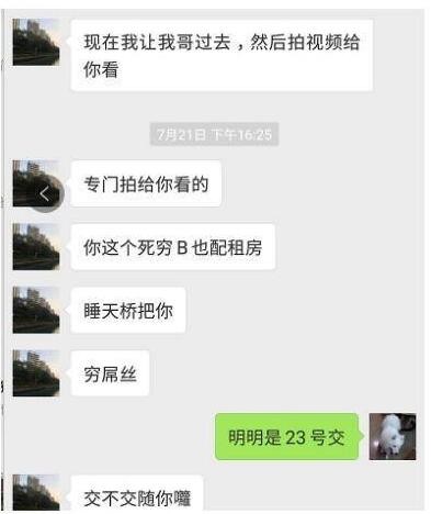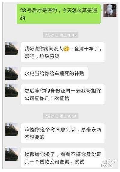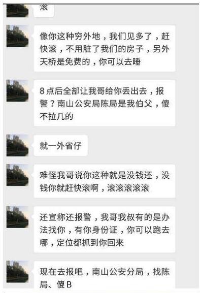 根据当事人微信聊天截图可见,因网友没有答应要求,房东不仅使用“垃圾穷货”“外地仔”等用词进行语言辱骂,还威胁将房间行李“扔出去”,泄露她身份证复印件和电话号码给贷款公司,并自称其伯父为“南山公安分局陈局”。随后网友向警方报警求助。